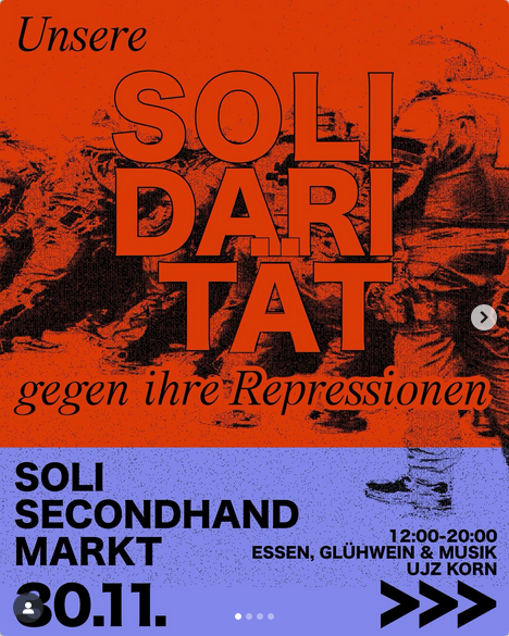 𝓤𝓷𝓼𝓮𝓻𝓮 𝓢𝓸𝓵𝓲𝓭𝓪𝓻𝓲𝓽ä𝓽 𝓰𝓮𝓰𝓮𝓷 𝓲𝓱𝓻𝓮 𝓡𝓮𝓹𝓻𝓮𝓼𝓼𝓲𝓸𝓷❤️🔥Am 30.11. wird mit Musik, Glühwein und Küfa die Antirepressionskasse gefüllt!💸Ihr könnt von 12-20 Uhr Kleidung und Kunst zum Zwecke der Solidarität kaufen! Die Einnahmen werde zu 100% für die entstanden Repressionskosten genutzt.Ihr wollt im Vorhinein Kleidung spenden, die dann am Sonntag verkauft wird? Bringt sie vom 23-27.11. von 17-20h in […]
